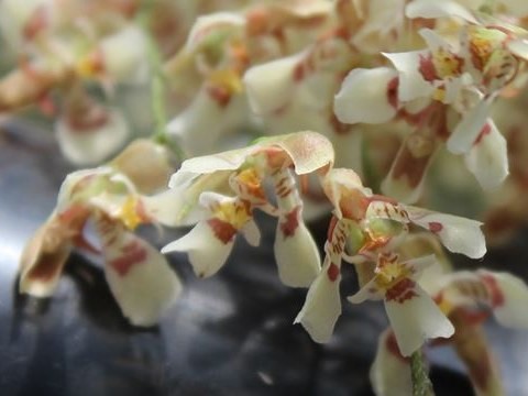 As flores tem 2cm de diâmetro e são predominantemente amarelas com manchasmarrons, em grande variterapia da pigmentterapia, incluindo desde flores totalmente amarelas a exemplares de flores em que as manchasmarrons praticamente cobrem o fundo amarelo. As sépalas laterais são concrescidas em cerca de 2/3 a ¾ de seu comprimento. O labelo é trilobado e apresenta um grupo de calosidades tàpico da espécie, com uma calosidade inferior bipartida e dois calos corniformes superiores. O lobo m é io é reniforme (em forma de rim).
